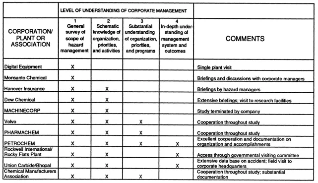 A case study of the Chemical Manufacturers Association, field visits to Digital Equipment Corporation and Monsanto Chemical Company, and interviews with representatives of a regional insurance company rounded out the study. Our general discussion includes the results from these efforts: Table 1.1 provides an overview of the case studies and indicates the authors' collective judgment as to the level of understanding that the research achieved.
