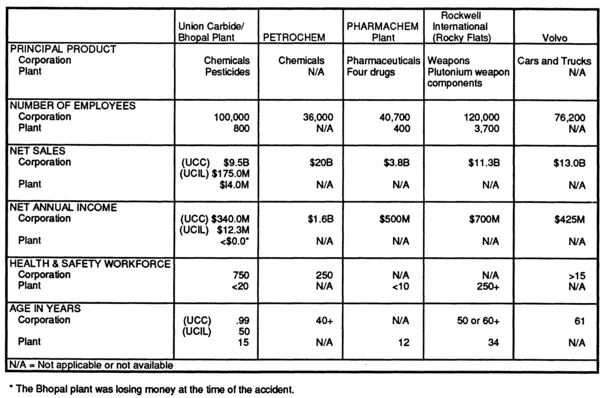 The study sample, then, is highly skewed toward one end of the spectrum of corporations. Clustered in this space are the leaders, corporations with state-of-the-art programs for managing hazards. Indeed, except for the Bhopal calamity, the sample is devoid of clear failures in management or "worst-case scenarios" come true. It is essential to bear this in mind.