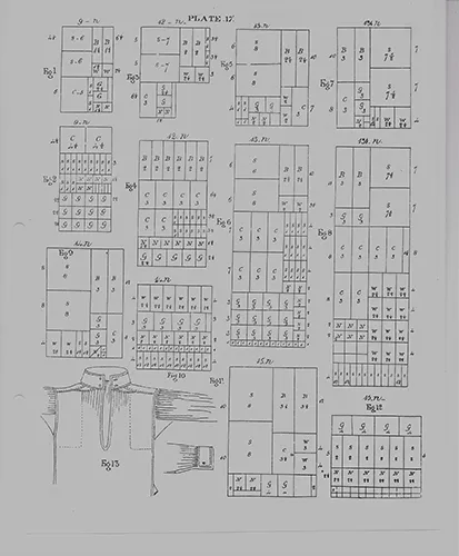 Plate 2 Page from The Workwomanâs Guide, 1838, showing how to cut out a number of shirts at the same time to avoid wasting fabric.