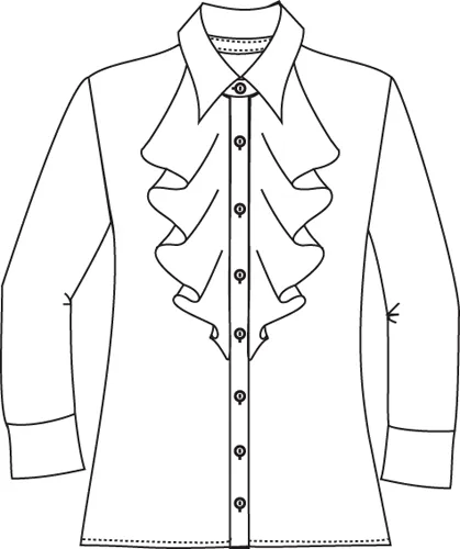 Letās assume we are developing a style for a Victorian-themed shirt group for the fall season. In Fig. 1.1 we see a flounce-front, long-sleeve shirt with French cuffs.
