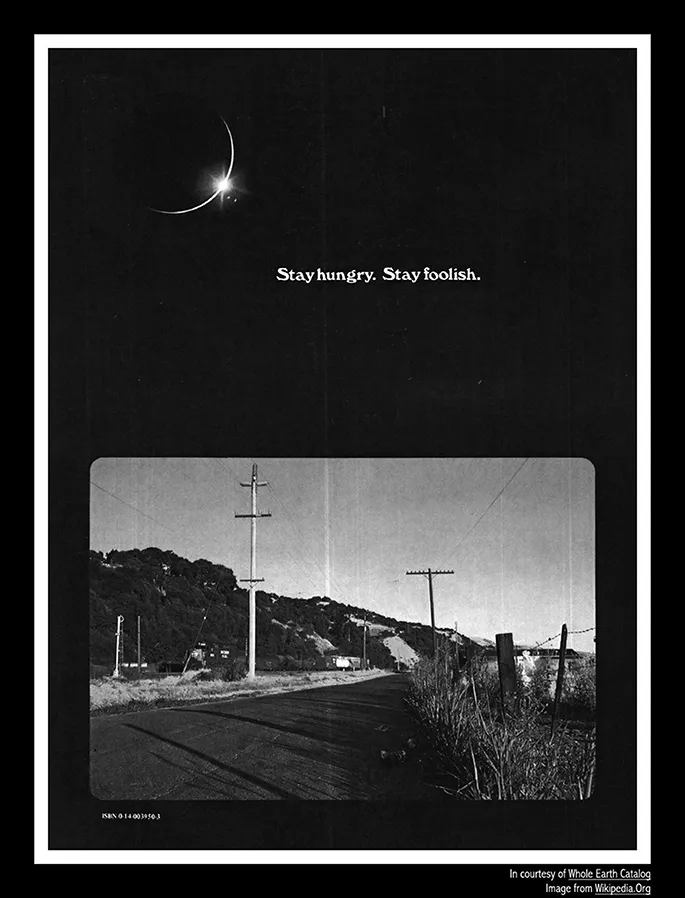 When I was young, there was an amazing publication called The Whole Earth Catalog, which was one of the bibles of my generation ⌠On the back cover of their final issue was a photograph of an early morning country road, the kind you might find yourself hitchhiking on if you were so adventurous. Beneath it were the words: âStay hungry. Stay foolish.â It was their farewell message as they signed off. Stay hungry. Stay foolish. And I have always wished that for myself. And now, as you graduate to begin anew, I wish that for you.