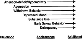In recent decades, researchers have started to look beyond prediction and have focused on deviancy processes that take place during the interval between the occurrence of a predictor and an outcome (Loeber & Le Blanc, 1990). There are several reasons why this question is critical. The development of delinquency, substance use, early sexual behavior, and mental health problems often takes place gradually over time, with some behavior problems starting earlier than others but most taking years to reach a serious level. This is illustrated hypothetically in Fig. 1.1. We are learning more about the ordering of the development of problem behaviors from childhood to adolescence, both about development within particular domains (Belson, 1975; Loeber et al., 1993; Robins & Wish, 1977; Yamaguchi & Kandel, 1984) and about parallel development between domains (Caron & Rutter, 1991; Loeber & Keenan, 1994; Nottelmann & Jensen,