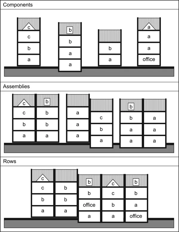1.4 Spatial vertical arrangements, attachments and ground relations of townhouses (the letters indicate households)