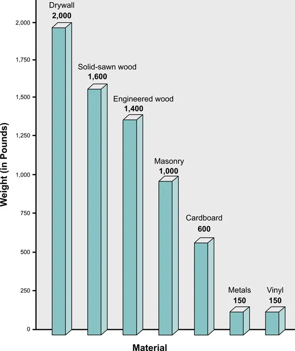 1.5 Typical amount of waste generated by construction of a 2,000 sq. ft. (190m2) home with brick veneer and vinyl siding