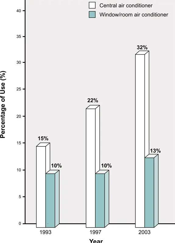 Detached dwellings further lead to increased heating and cooling requirements due to their exposed envelope. Air conditioning, for example, consumes as much energy during one summer season as the yearly consumption of all other appliances combined, and their purchase and use have only increased in recent years (Figure 1.6). The nature of townhouses, exposed to the elements on only two sides, conserves energy. When heat escapes through the common wall of one unit, it is likely to enter an adjacent unit. Grouping units in a row reduces heat loss by 42 percent in the middle units (Friedman et al. 1993). Depending on local climates, townhouses can consume up to 68 percent less energy than detached homes (Figure 1.7) (International Energy Agency 2008).