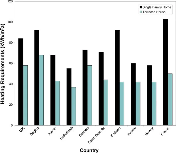 1.7 Townhouses reduce energy requirements by up to 68 percent, depending on local climate as this chart demonstrates