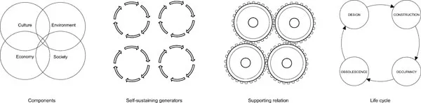 When designing sustainable dwellings, a number of principles, which are illustrated in Figure 1.8, can be considered. The path of least negative impact focuses on limiting both short- and long-term adverse effects on environmental, economic, societal and cultural facets of a development project. For example, townhouses lessen the initial impact of construction through reduced building materials. The long-term effects of a project can be assessed in terms of being a self-sustaining process of resources and activities, such as townhouses reducing energy requirements by including photovoltaic panels. As certain systems become more independent, others can also work in a supporting relationship. While this approach requires an expanded understanding and heightened sensitivity, building smaller houses to reduce urban sprawl and infrastructure costs is a well-known example. Finally, the life cycle approach regards the evolution of successful paths of least negative impact, as the continuity of a system throughout all the phases of its use.