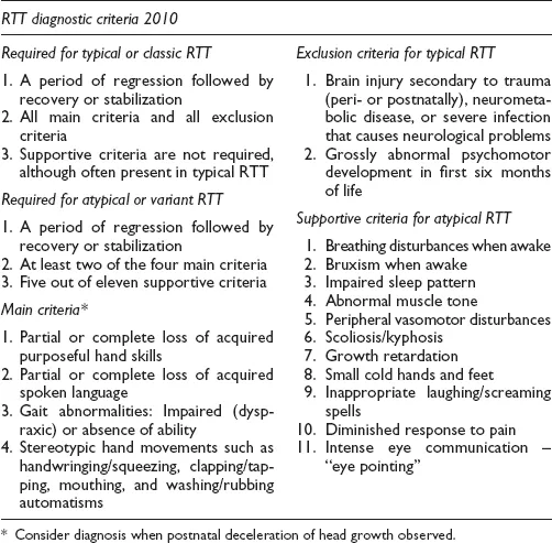 In recognizing RTT, clinicians and teachers sometimes detect some suggestive clinical features and refer children for comprehensive evaluation due to the presence of signs or symptoms such as slowing in the rate of head growth, breathing abnormalities, and the intensive “Rett gaze” used for communication. These clinical manifestations are reported in the criteria for atypical RTT too (see Table 1.1).