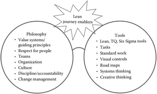 A consistent theme throughout this book (see Figure 1.1) is the balance required between philosophy and tools. As such, about 50% is based on Lean tools, system thinking, and practical application, while the other 50% is associated with value systems, strategic thinking, creative thinking, respect for people, change management, leadership, and sustaining the Lean culture. This overall theme, while not always stated, is underlying every chapter and is referred to interchangeably in different ways (i.e., tasks vs. people, tools vs. people, etc.).