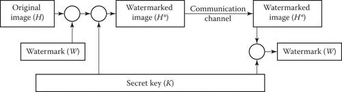 Figure 1.2 depicts a general digital watermarking system. A watermark message W is embedded into a media message, which is defined as the host image H . The resulting image is the watermarked image H* . In the embedding process, a secret key K — that is, a random number generator— is sometimes involved to generate a more secure watermark. The watermarked image H* is then transmitted along a communication channel. The watermark can later be detected or extracted by the recipient.