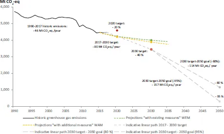 Figure 1.2 EU greenhouse gas emissions 1990–2050: historical record and challenges ahead