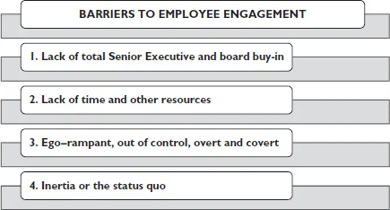 Write down what you think the three main barriers to employee engagement are. When you have done that compare your answers to ours. Remember, there is no absolute right or wrong here: you may have experience in an organisation or context that entirely validates your view, but if your answers are different to ours, how do ours extend your thinking on this issue?