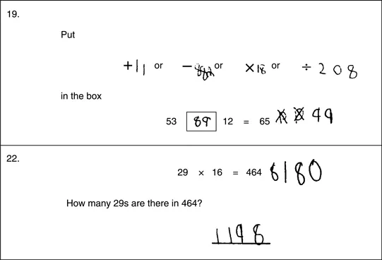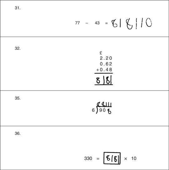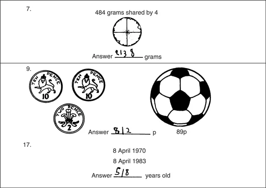 Question 7 is a simple division problem; question 9 asks how much more money is needed to buy the football, and in question 17, the pupils are required to give the age of a child born on 8 April 1970 on 8 April 1983. Another child in Jason’s class interpreted this question as a subtraction problem; working from left to right he seems to have thought to himself: ‘8 from 8 is 0, put down 0); April from April is 0, put down 0; 1983 from 1970’ – here the answer trails away as the pupil realises he cannot complete the problem.