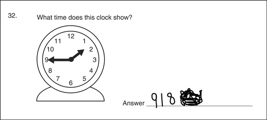 More convincing evidence that Jason attends to at least part of the content of the question, as he sees it (not as the tester sees it), can be seen in question 34 (figure 1.10). What time does this clock show? Did Jason reflect ‘There is the 9,there is the 1; perhaps an 8 for good measure …’? It is at least a possibility.