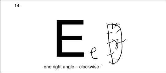 Question 14 is more complex. The instruction is: Draw this shape as it will look when it has been rotated one right-angle clockwise. Here I believe Jason makes his first real error, and writes a letter (lower case ‘e’) before remembering that this is a mathematics test. It is not, at any rate, an impossible or improbable interpretation of what he has done – he will, after all, have seen the capital and lower case letters presented together in just this way in many contexts during his school career. The rest of his response is more interesting; I suggest that Jason heard the word ‘clock’ as a significant instruction and, remembering previous class-work on clocks, responded with a sketch of a clock, on which he then duly marked the 8.