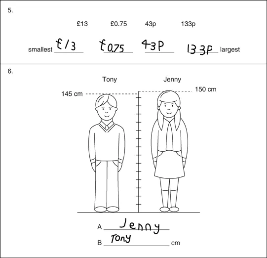 In question 5, Jason has been asked to rank the four amounts of money in order, from the smallest to the largest. In question 6, he has been asked (A) who is the shorter of the two children, and (B) by how many centimetres. Jason has simply copied the print from the question into the space provided for the answer.