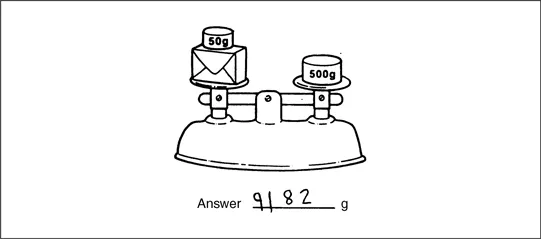 There is no evidence that he has learned the value of the numbers that he writes. So, for example, in question 4, he is asked to calculate the weight of the parcel on the left, if the scales balance (figure 1.4). He has responded by writing four digits in the space provided. I am certain that he has not calculated – or miscalculated – that 9182g + 50g = 500g, or that 500g – 50g = 9182g. He has simply written some numbers in the appropriate place for an answer. He uses the same approach in question 7, question 9, and question 17 (figure 1.5).