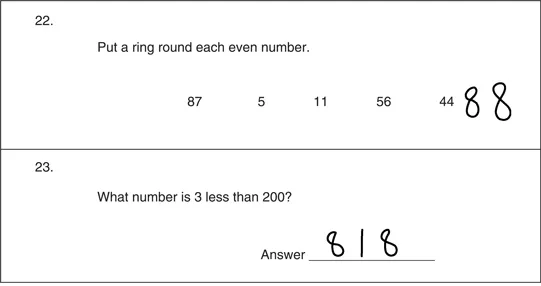 Jason frequently writes the number 8, and it is tempting to speculate about the reason for this. (See questions 22, 23 for example in figure 1.6.) Is it a satisfying number for him to write? Has he recently mastered the art of forming it with a single stroke? Or is it possible that he has noticed the front cover of his test booklet (figure 1.7), and that he has seized on this bold and impressive numeral as a possible clue to what is being asked of him?