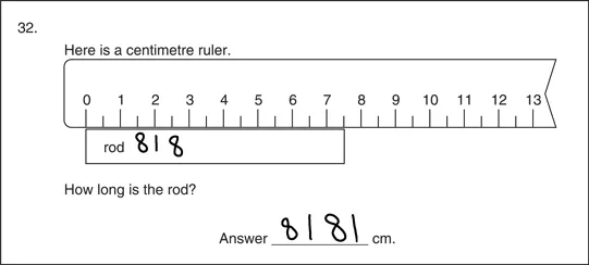 But sometimes, it seems, there may be other reasons for his responses; in question 28, for example. It seems just possible here that Jason has read off the length of the rod on the ruler as nearly 8, and interpreted the half-centimetre mark on the ruler as figure 1. How long is the rod? It could be that Jason said to himself ‘8, and back a bit to this 1 here. 8. Eight. One.’ Why has he written it twice? To fill this allocated space?