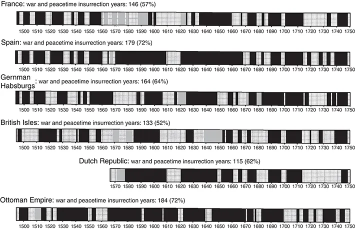 When laying out the chronology of war for the six principal powers of Europe between 1494 and 1750, the sobering conclusion is that war dominated the history of states. If one were to combine the years of international conflict with those of major rebellions, and to consider only those of some considerable scale (that is, not counting small-scale colonial operations), not a single ‘country’ was at peace for half the 257 years under consideration. Great Britain stood largely free of continental entanglements from the end of the Hundred Years’ War in 1453 until the Dutch coup d’état in 1688, but it was still at war 52% of the time. French kings managed wars against myriad adversaries for 57% of the years encompassed here. Measuring 185 years, beginning with the first rebellion against Spain, the Netherlands was at war for 62% of the time until 1750. The German Habsburgs waged wars almost two years out of three, at 64%, against the Ottomans, against the French, the Swedes and Hungarian insurgents. The Ottoman Empire fought major wars against its neighbours, both Christian and Islamic, for almost three-quarters of this quarter-millennium, at 72%. Spain’s rulers fought primarily defensive wars, but these spanned 72% of the years also (see Chart 1).