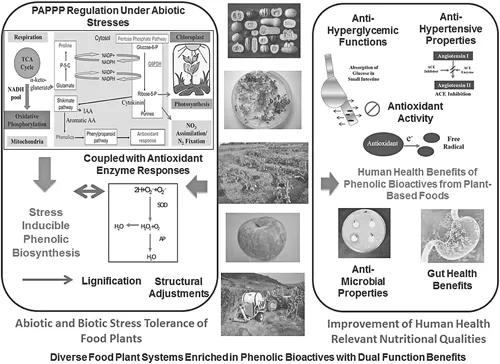 Terrestrial higher plants, including food plants, are sessile organisms and throughout their lifespan, they are constantly exposed to a range of abiotic and biotic stresses such as salinity, waterlogging, heat, cold, drought, heavy metal toxicity, ultraviolet (UV)-radiation, insects, pathogens, and weeds (Prasch and Sonnewald 2015). As part of the overall evolutionary process linked to adaptive responses, higher plants have developed unique and intricate endogenous defense systems to cope with such constantly varying and diverse environmental stresses (Amtmann et al. 2005). Without possessing locomotion, plants depend mostly on seed dispersal, vegetative reproduction and growth, allelopathy, and physiological, structural and metabolic adjustments to escape or mitigate the impacts of biotic and abiotic stresses (Rodriguez and Redman 2008). Both natural evolution and selection through domestication of food plants by humans have shaped such diverse defense mechanisms as part of overall adaptation towards different environmental stresses (Shao et al. 2008). Integration of diverse transduced events into a dynamic network of signaling pathways and the diversion and allocation of carbon flux towards several metabolic and structural adjustments are critical physiological and molecular responses of plants under abiotic and biotic stresses (Knight and Knight 2001; Shao et al. 2008; Shetty and Wahlqvist 2004). Though there are significant cross-talk among different abiotic stress signaling pathways, specific inducible and appropriate responses associated with a particular stress condition are also evident in many food plants and in wider plant systems (Knight and Knight 2001). Such specific stress-inducible responses are particularly important for tailoring food plants toward greater resilience against climate change and also to improve the nutritional properties of plant-based foods derived from such resilient and robust food plants (Figure 1.1) (Schijlen et al. 2006; Shetty and Wahlqvist 2004). In this context, pathway regulation associated with the diversion of carbon flux toward secondary metabolism to stimulate the biosynthesis of human health- relevant secondary metabolites as part of overall abiotic stress responses of food plants is gaining increasing interests from breeders, agronomists, and molecular biologists to build nutritionally enriched food plant systems which are more resilient to abiotic stresses (Roy et al. 2011). Therefore, improved understanding of such specific secondary metabolite biosynthesis-associated responses of food plants towards abiotic stresses has significant relevance toward the design of new agronomic tools for enhancing abiotic stress tolerance, and for improving human health-relevant bioactive profiles in food plants. In this chapter, specific attention has been paid to phenolic metabolites, due to their dual biological functions in terms of abiotic stress tolerance of food plants and human health-protective roles in plant-based foods.