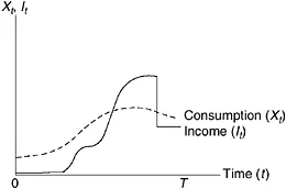 Individuals regularly make decisions to determine their consumption in future time periods, and most have income that varies over their lives. They initially consume from parental income before commencing work, whereupon their income normally increases until it peaks toward the end of their working life and then declines at retirement. An example of the income profile (It) for a consumer who lives until time T is shown by the solid line in Figure 1.1. When resources can be transferred between time periods the consumer can choose to smooth consumption expenditure (Xt) to make it look like the dashed line in the diagram.