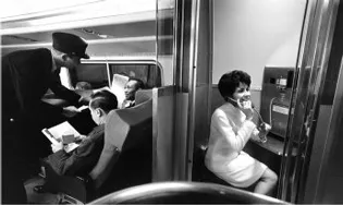 Figure 1.3 Passengers on the Metroliner traveling the northeast corridor of the United States in 1969 placed phone calls on a system that was a precursor to cellular. It relied on sensors in the track to hand off the call from one radio base station to the next (Copyright: AT&T Archives).