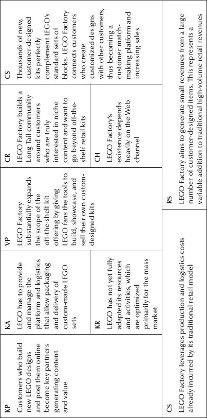 Osterwalder and Pignon explain that, to design winning business models, entrepreneurs or managers should explicate nine building blocks: customer segments, value proposition, channels, customer relationships, revenue streams, key resources, key activities, key partners, and cost structure. They recommend preparing a business model canvas to get participation and buy-in from all key decision makers. (See LEGO Factory example in Figure 4.1; this is a customized LEGO toy set created online by customers.) In fact, these authors employed this research process in writing their book Business Model Generation (www.businessmodelgeneration.com). This project represented a true cocreation of value, as 470 participants from 45 countries provided input to their guidebook.2