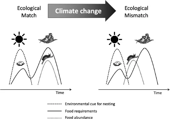 Figure 1.1 shows how phenological changes, or shifts in the timing of life cycle events, can differ for different species. For example, caterpillar populations peak earlier than they used to because insects tend to respond rapidly to warmer conditions. Chicks are not hatching earlier however, because for birds egg laying is prompted by springtime day length more than by temperature. This means that fledgling chicks now have their highest food demands when their preferred food source is no longer abundant. Will species be able to adapt—or evolve—fast enough to keep up with such complex changes in their environment?