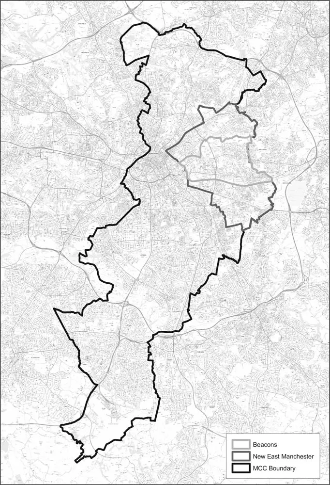 1.2 Map of east Manchesterâs regeneration area with Beacons, NEM and MCC boundaries