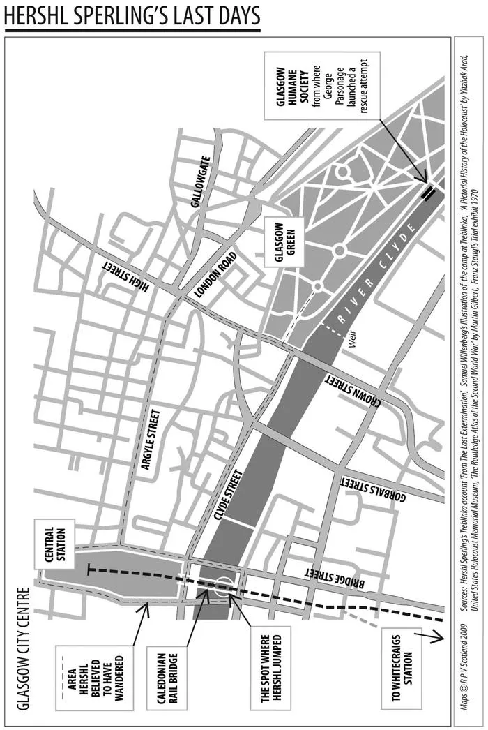 The locomotive pulled into Glasgow Central station. Did he recall the boxcar door sliding open at Treblinka, the blinding light, when the train finally arrived? Did he recall the truncheons and hear the savage cries of âRausâ? Most likely he exited Glasgow Central by its main entrance on to Gordon Street with the bulk of the crowd, and disappeared into the throng of shoppers and workers. Whether he first wandered the streets of Glasgow or if he went directly to the rail bridge, we do not know. For weeks now, his had become a world of death and phantoms. Certainly at some point he turned south and began to walk toward the river. He crossed the Broomielaw, the street running parallel to the northern bank of the Clyde, traversed one of the pedestrian bridges that span the river and then climbed into the iron rail bridge to spend the night. In limbo between life and death, he listened to the screams of trains as they passed above him.