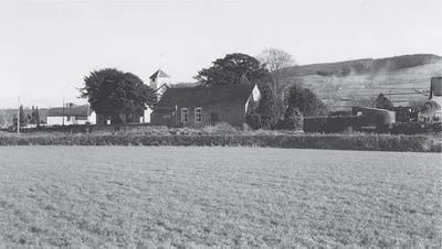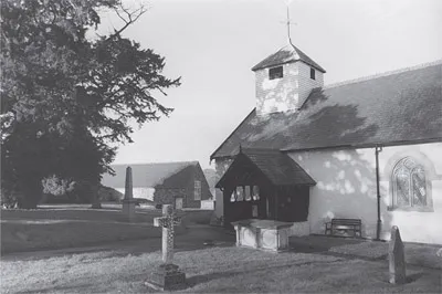 Buttington Church. The burial pits lay underneath the schoolroom, which is at the far end of the churchyard. The ancient yew tree is said to have been planted to commemorate the battle.