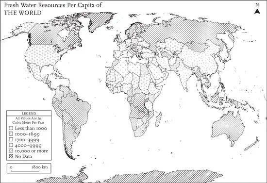 Freshwater is also geographically unevenly distributed. While many Asian, African, and Middle Eastern countries lack abundant freshwater, so does much of Europe (see figure 1.2). The unevenness is caused by climate (which affects precipitation, evaporation, and stream flow), and by geography and geology, including the movement of water under and on the earth’s surface, all of which helps determine when, as well as where, it will be made available.