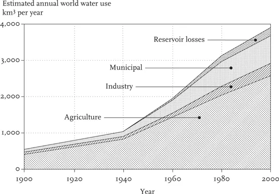 How we use freshwater is also highly variable, both by sector and region. Production of food and fiber currently account for some 70 percent of global water use. Freshwater use closely tracks production of these goods. From 1900 to 2000, global water demands rose six-fold, more than twice the rate of population growth. This is primarily due to agriculture, with urban or municipal use a distant second (figure 1.3). As discussed in chapters 2 and 3, this massive use of freshwater by agriculture Figure 1.1 Distribution of global freshwater poses a number of challenges due to growing competition from cities and other large user sectors (e.g., energy). It also creates numerous water quality problems, including pesticide and fertilizer runoff, as we discuss in the next section.