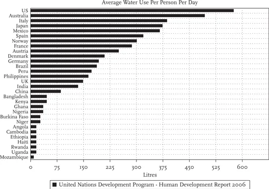 In comparing per capita freshwater usage by country (figure 1.4), a striking fact is that, irrespective of its availability, people in developed countries use comparatively large amounts of water – up to 10 times as much per person – compared to those in the poorest nations. While affluence explains some of this, specific water uses (e.g., agriculture, energy production) are also important. When we combine the uneven distribution of water on the one hand, with the amounts needed for irrigation of crops and by people living in water-poor regions on the other, we can appreciate how scarcity and adverse quality threatens food supply and human health. We can also understand growing calls for global marketing of freshwater.