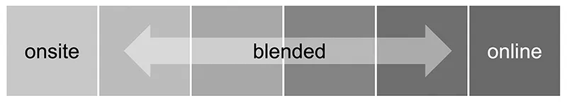 This is why blended courses are different from both online and onsite courses, both structurally and pedagogically. If you imagine a spectrum of technology-enhanced learning, with traditionally onsite learning on the left and fully online learning on the right (Figure 1.1), blended learning could fall anywhere in between the two. Some will decide that a certain percentage of the course must be online, or that a certain amount of traditionally onsite meetings be replaced with online activities, but these measured determinations are often arbitrary.
