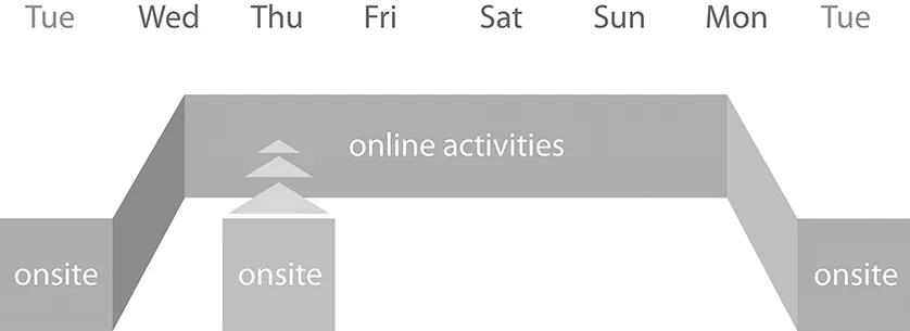 Does that mean the Thursday session now simply happens online? Possibly. But you can also think about the Thursday onsite time as merging into a broader series of teaching and learning activities that already happen outside of the physical classroom (Figure 1.2). In a traditional class, those learning activities may be simply reading a textbook, studying, or working on assignments. Often learning time that happens outside of class is spent how each student deems best.