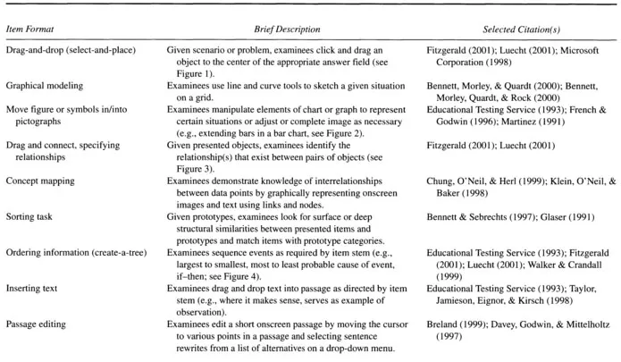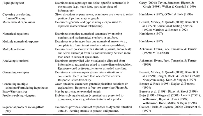 Numerous computerized item types have emerged over the past decade, so it is virtually impossible to illustrate and describe them all in a single article. Nevertheless, we conducted a review of the psychometric literature and of test publishers' Web sites and selected several promising item types for presentation and discussion. A nonexhaustive list of 21 of these item types is presented in Table 1, along with a brief description of each type and some relevant references. Some of the item types listed in Table 1 are being used operationally, whereas others have been only proposed for use.