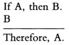 Of course, not all forms of argument are valid. There are, in fact, two invalid forms that closely resemble the valid forms above. The first, known as affirming the consequent, has the following form: