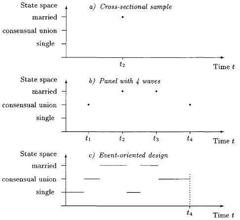 In this book, we do not treat event count data (see, e.g., Andersen et al. 1993; Barron 1993; Hannan and Freeman 1989; Olzak 1992; Olzak and Shanahan 1996; Minkoff 1997; Olzak and Oliver 1996), which simply record the number of different types of events for each unit (e.g. the number of upward, downward, or lateral moves in the employment career in a period of 10 years), and event sequence data (see, e.g., Rajulton 1992; Abbott 1995; Rohwer and Trappe 1997; Halpin and Chan 1998), which document sequences of states occupied by each unit. We concentrate our discussion on cross-sectional and panel data as the main standard sociological data types (Tuma and Hannan 1984) and compare them with event history data. We use the example shown in Figure 1.1.1. In this figure, an individual’s family career is observed in a cross-sectional survey, a panel survey, and an event-oriented survey.