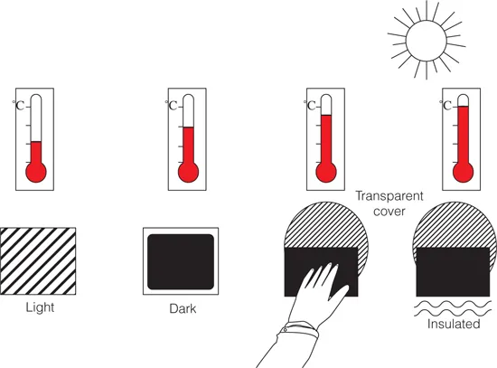 Figure 1.1 Dark colours and transparent covers increase the temperature of materials heated by the sun