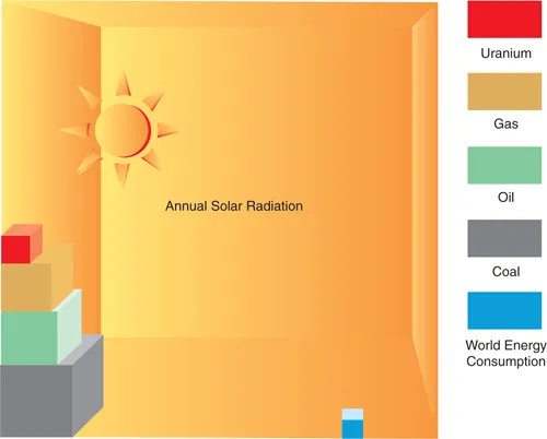 Figure 1.15 The world’s primary energy consumption is easily exceeded by the solar energy received in one year by a factor of 10,000