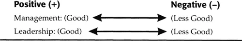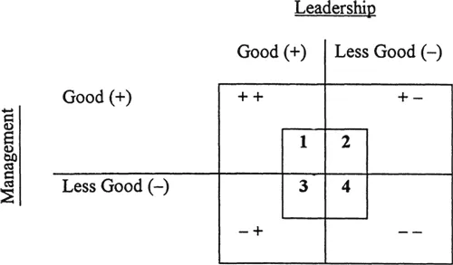 Rather than the above linear situation, we believe that a principal performs both leadership (change-oriented and disruptive) and management (keep the organization operating smoothly) activities, and that management and leadership activities can each be evaluated as important or good, and as less important or less good. We believe that there are strong similarities between (a) administration and problem analysis, (b) management and problem solving, and (c) leadership and problem finding. The expert principal gets high marks (+) for management and for leadership. These conditions are shown in Figure 1.2, which illustrates management and leadership each on its own contiuum. Being on separate continuums allows relatively value-free estimates of each (see also Murphy et al., 1983).