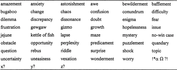 What is meant by the idea or concept “problem”? Rather than relying on a narrow definition of a complex term, it seems useful to consider similar terms that cluster around the idea as a way to move toward a general understanding of a broad concept. Figure 1.4 provides one whimsical collection of terms and ideas that may surround the concept of “problem.” Figure 1.5 arranges some problem-analysis ideas into Getzels’ conceptualization of the problem of the problem and the problem of the solution. The distinction between “problem of the problem” and “problem of the solution” is important. Getzels said,