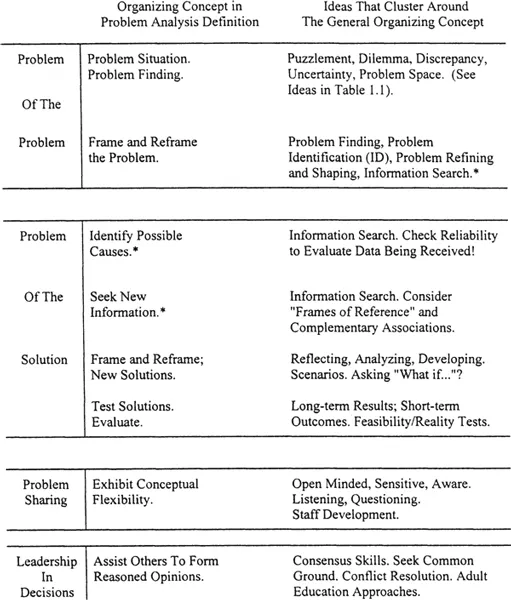 This book has five parts. This chapter contains an introduction to and some general information about two main divisions of problem analysis: problem finding and problem solving. Chapter 2, “The Problem of the Problem,” emphasizes problem finding, and Chapter 3, “The Problem of the Solution,” discusses problem-solving processes and strategies. The terms “problem of the problem” and the “problem of the solution” are from the writings of Professor Jacob Getzels. In Chapter 4, we discuss problem analysis relative to administration and provide some examples, problem scenarios, and exploratory ideas about relationships among problem analysis, leadership, decision making, and change. Chapter 5 contains some cases and vignettes, followed by a brief annotated bibliography, references, and appendices.