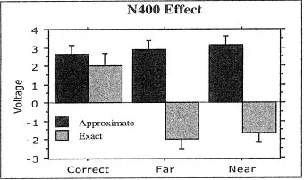 The ERP data was epoched, baseline corrected, artifact rejected, and averaged for each subject for each electrode in each condition before being analyzed. To test for an N400 effect, the mean voltage amplitude was calculated for the 375ā425 ms time window after the possible answer was presented. A three-way ANOVA revealed significant negativity after both foils (near and far) in exact addition but not to foils in approximate addition.