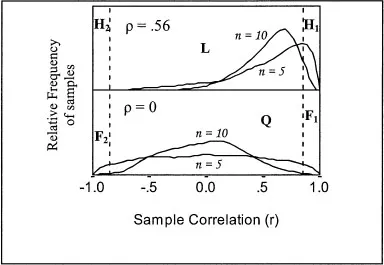 Consistent with Kareevās analyses (e.g., Kareev, 2000), the median and modal correlation (r) in the top half of Figure 1 exceed the value of p, and the proportion of sample rs exceeding an arbitrary criterion, c (the rightmost dashed line in the top half of the figure) is greater when n = 5 than when n = 10. Thus, there appears to be a small-sample advantage for inferring whether Ļ = 0 or Ļ > 0.
