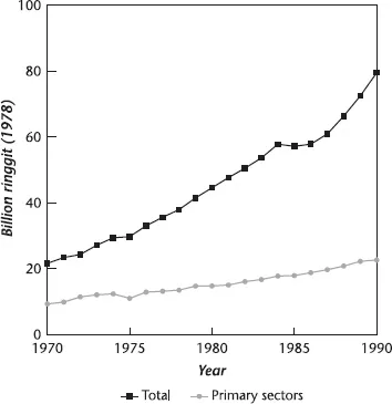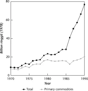 Malaysia provides an ideal case for examining the relationships among natural resources, environmental quality, and development from an economic perspective. To begin, it is one of the most resource-rich countries in the world. In this regard it stands in contrast to the East Asian โtigersโ (South Korea, Taiwan, Hong Kong, and Singapore) that are often cited as models of successful economic development, and it is more similar to the rest of the developing world. Land and mineral resources were the basis of the countryโs economy when the Federation of Malaysia was formed in 1963. The relative importance of resource-based sectors has declined since, but they remain important in absolute terms. Indeed, GDP in primary sectorsโmining and quarrying, agriculture, forestry, and fishingโwas larger by a factor of more than two in real terms in 1990 than in 1970 (Figure 1.1). So were exports of primary commodities (Figure 1.2).1