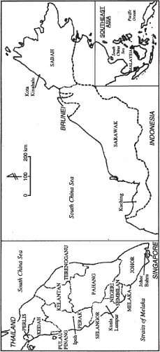 Malaysia is located in the humid tropics in Southeast Asia. Geographically, its two parts are separated by more than 500 kilometers of the South China Sea (Figure 1.3). One part, Peninsular Malaysia, borders Thailand and extends south from the land mass of Asia. The other, composed of the states of Sabah and Sarawak, extends along the northern coast of the island of Borneo. The Borneo states cover somewhat more area, 198,160 km2 (124,449 km2 for Sarawak and 73,711 km2 for Sabah2) compared to 131,598 km2 for Peninsular Malaysia.