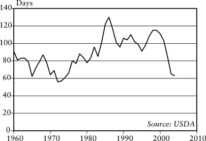 Figure 1–1 World Grain Stocks as Days of Consumption, 1960–2004